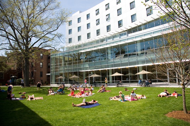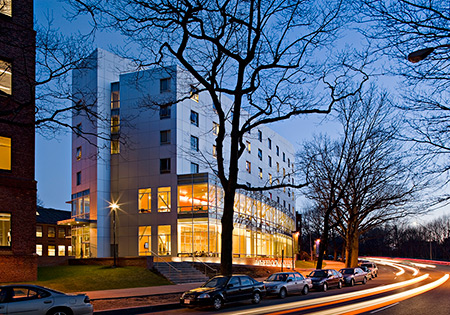 - The Campus Center building is LEED-certified and contains a new student center, dining hall, and residence hall with suite-style accommodations for 108 students. It reportedly has "magnificent views of Boston."
