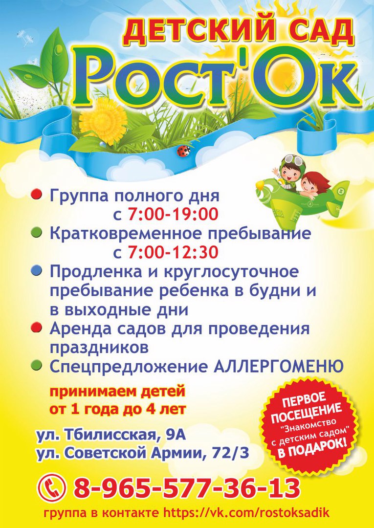 Уважаемые Родители! Частные детские ясли "Рост'Ок" расположены по адресам: ул.Советской Армии, д. 72/1 и ул. Тбилисская, д. 9А. Работаем 7-ОЙ год! Принимаем малышей от 1 года до 4 лет. Набор в группы ведём весь год при наличии мест.