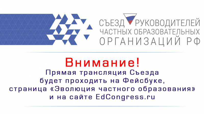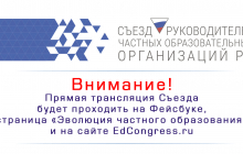 Прямая трансляция Съезда руководителей частных образовательных организаций РФ будет проходить на Facebook https://www.facebook.com/evoluziaobr/ и на сайте http://edcongress.ru